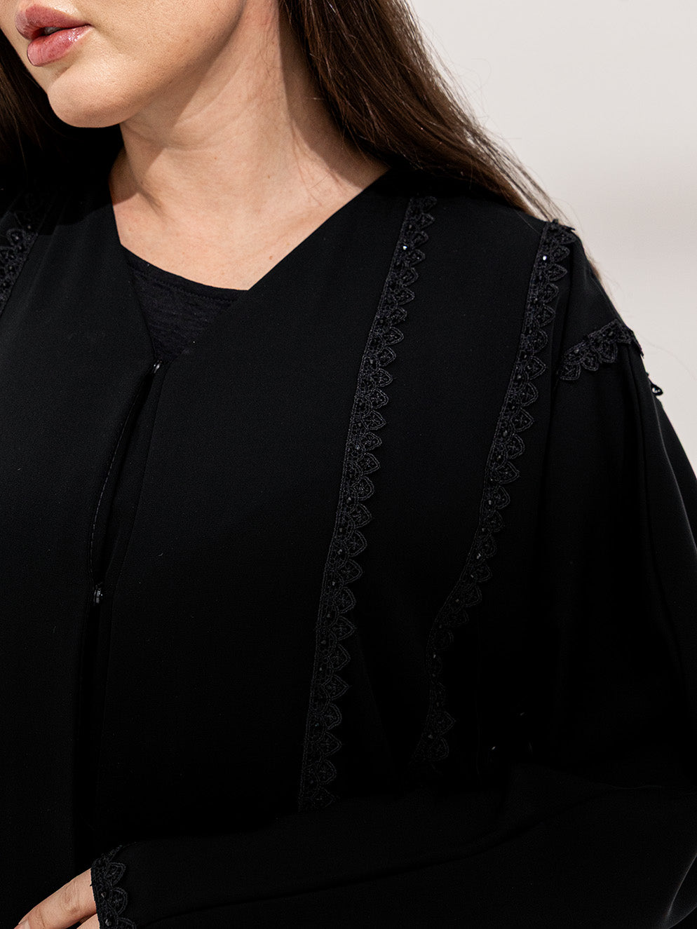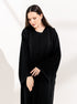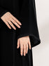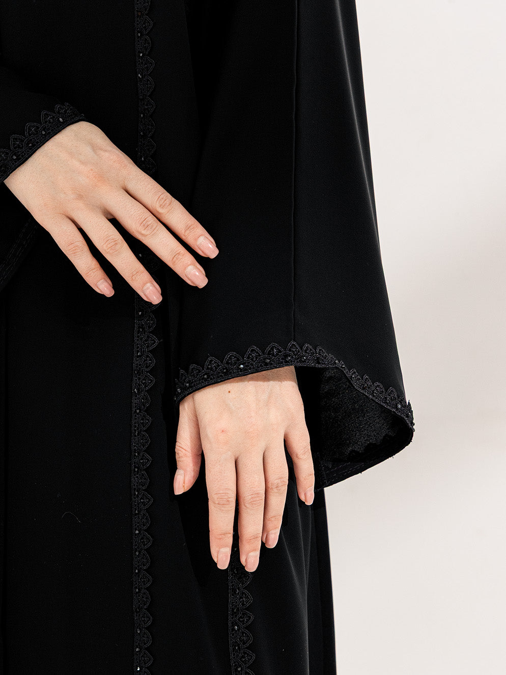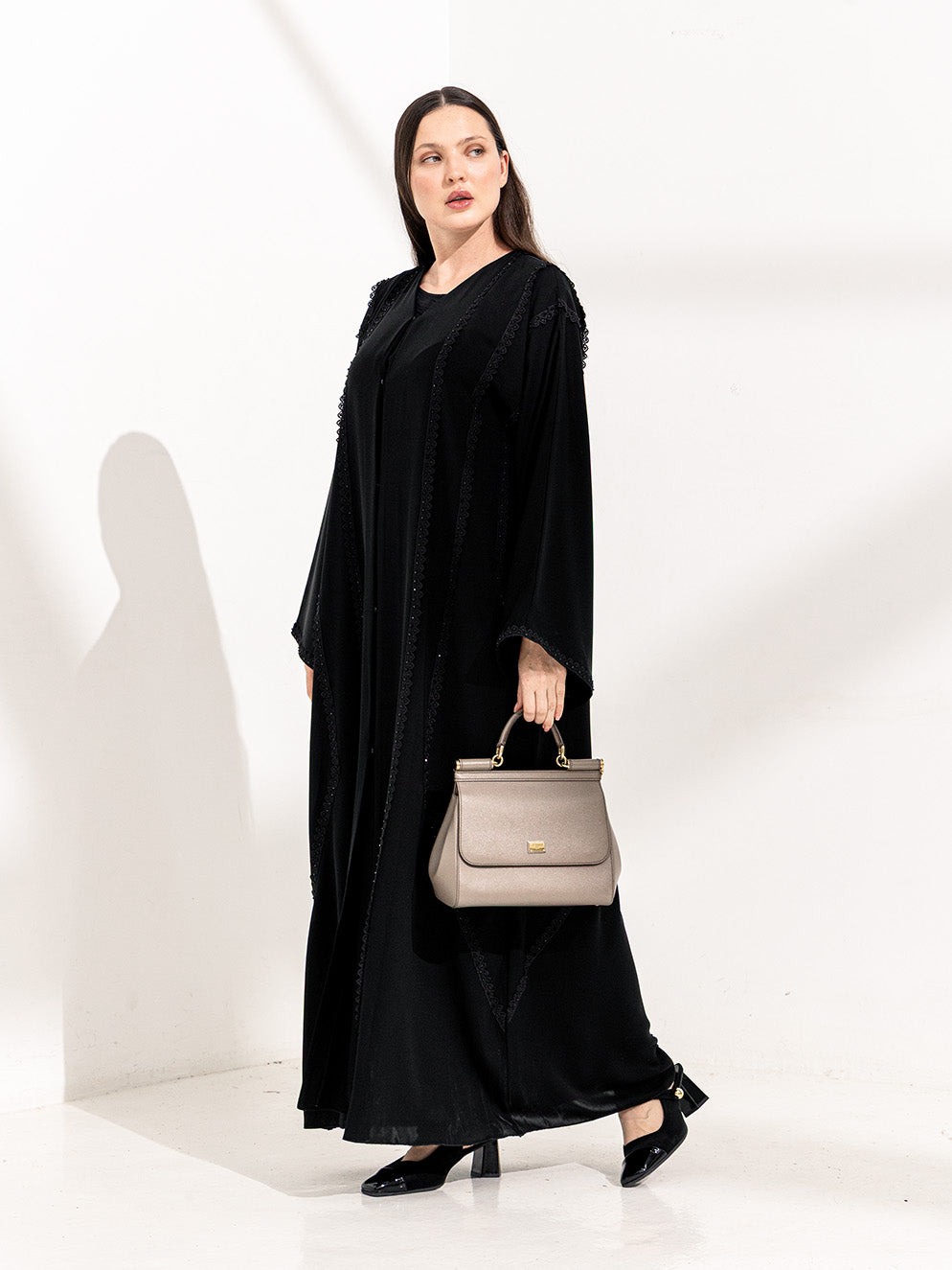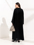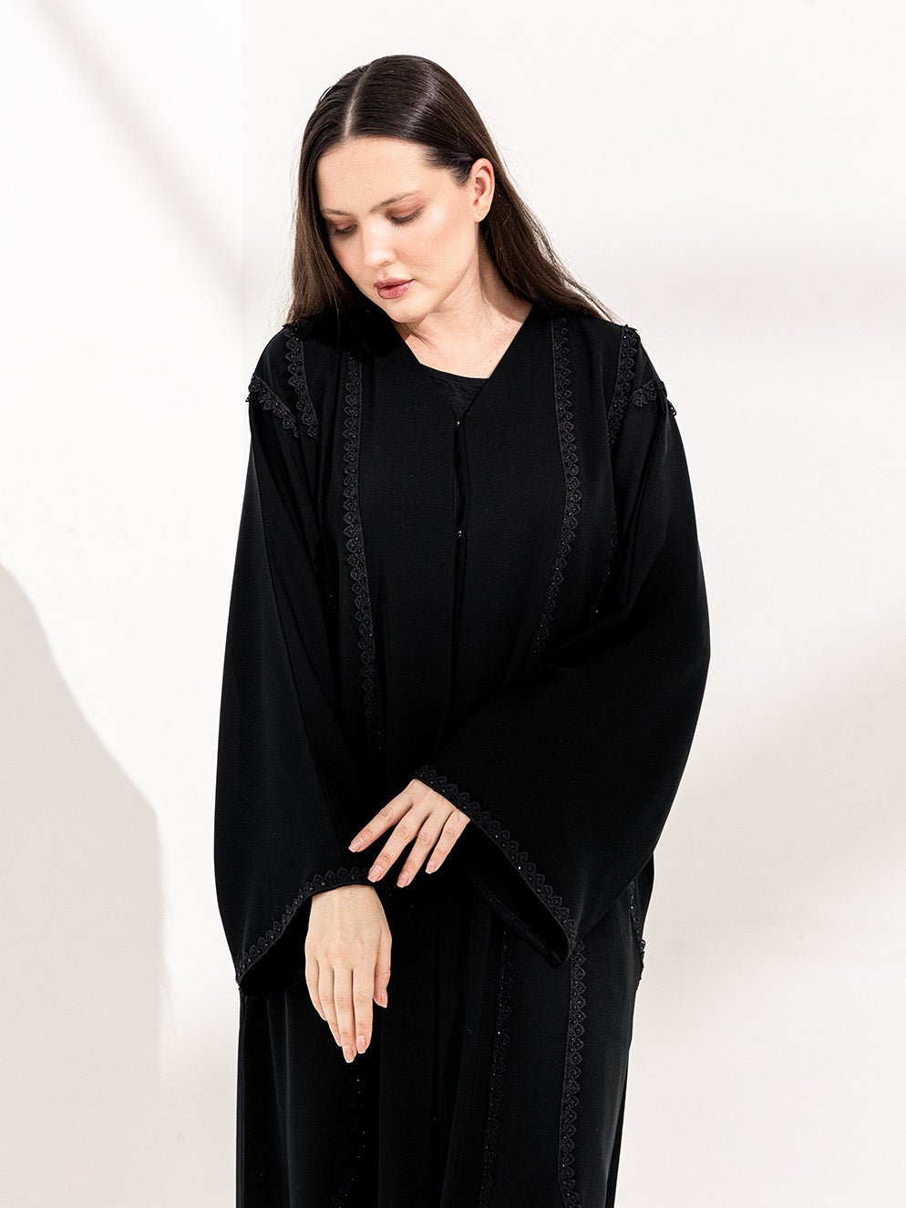 عباية سوداء بسوادٍ فاحم يعكس الفخامة والرقي، مطرزة بعناية بتفاصيل دقيقة تضيف لمسة راقية وأنثوية مميزة.