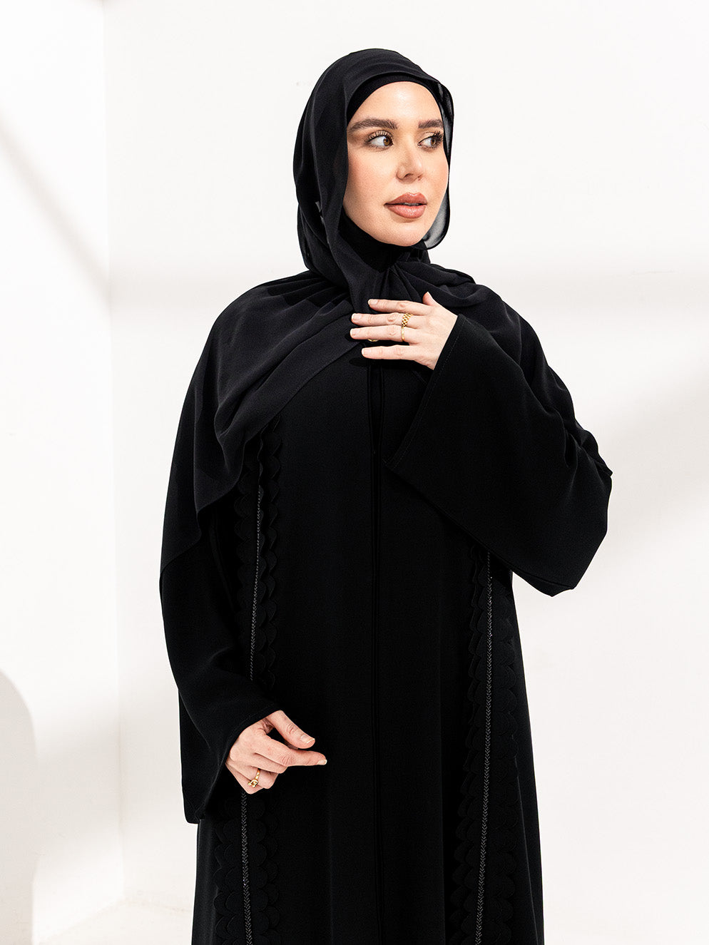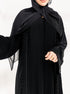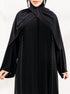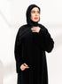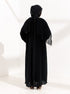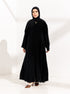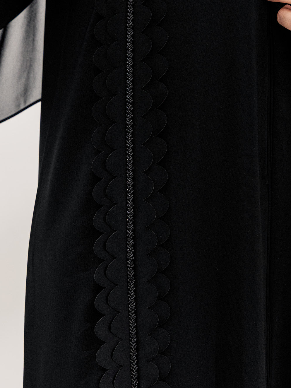 عباية سوداء بسوادٍ فاحم يعكس الفخامة والرقي، مطرزة بعناية بتفاصيل دقيقة تضيف لمسة راقية وأنثوية مميزة.