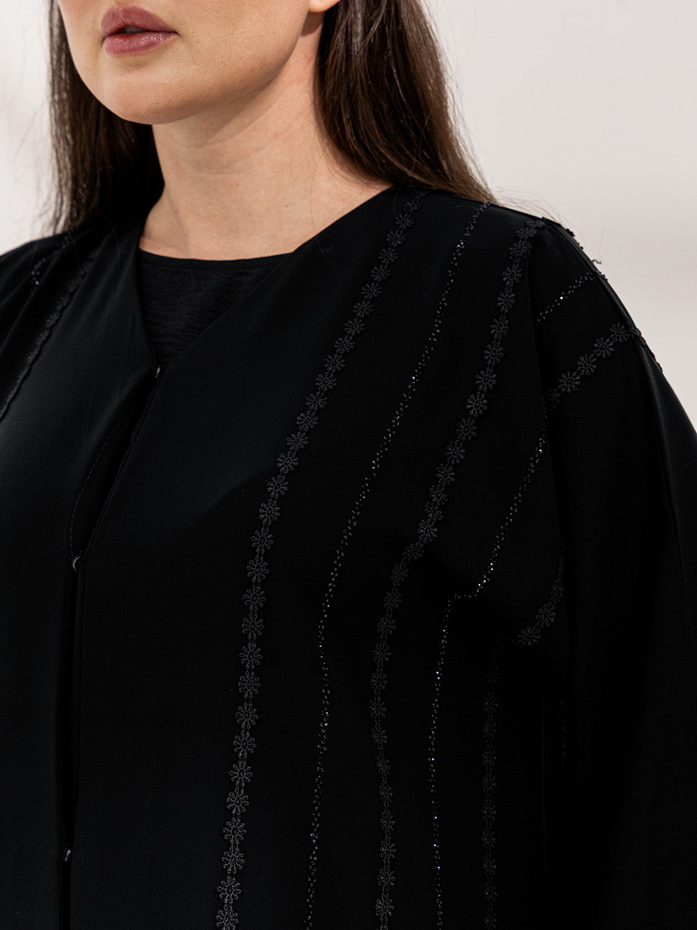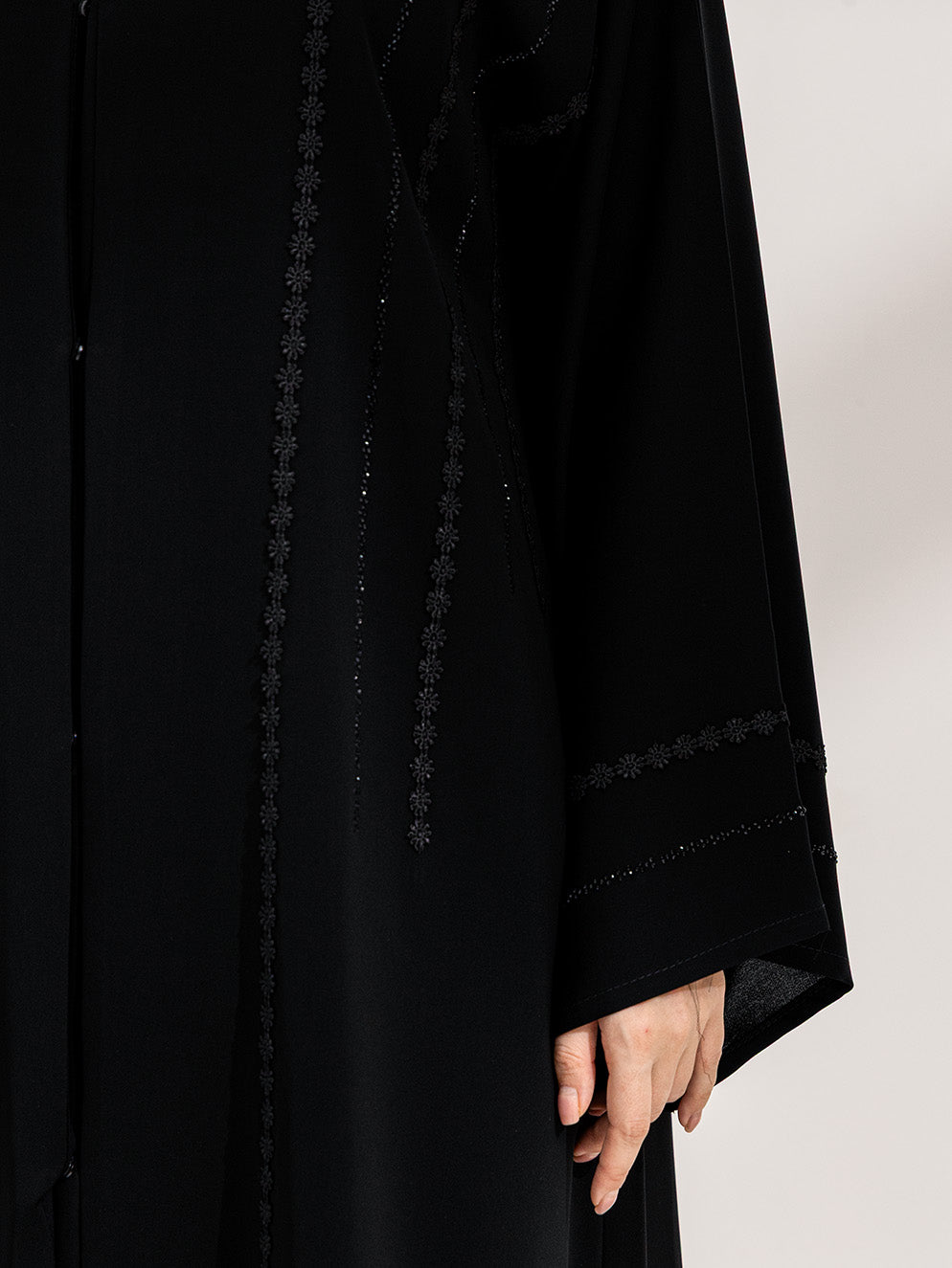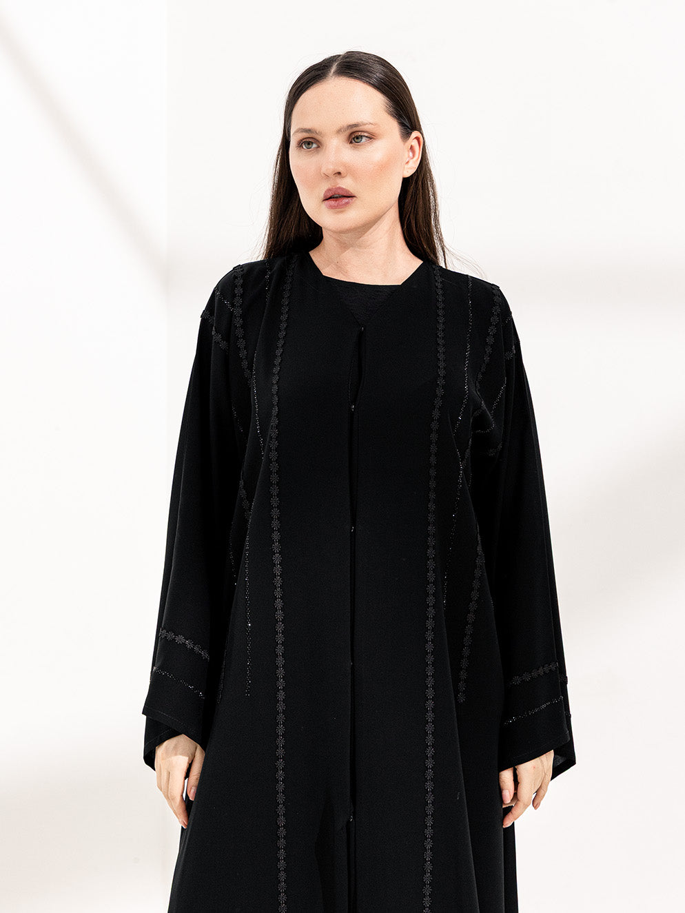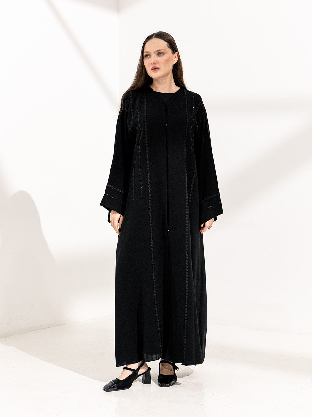 عباية سوداء بسوادٍ فاحم يعكس الفخامة والرقي، مطرزة بعناية بتفاصيل دقيقة تضيف لمسة راقية وأنثوية مميزة.
