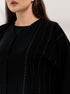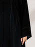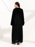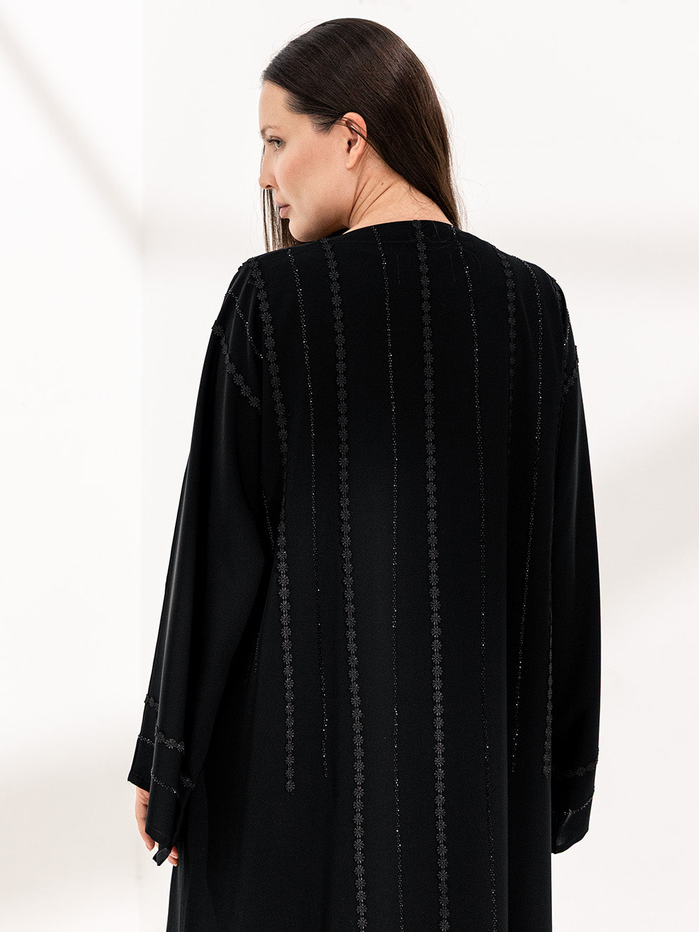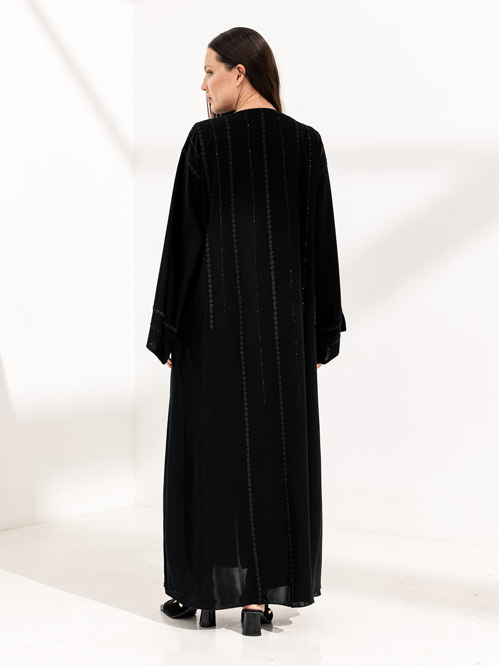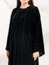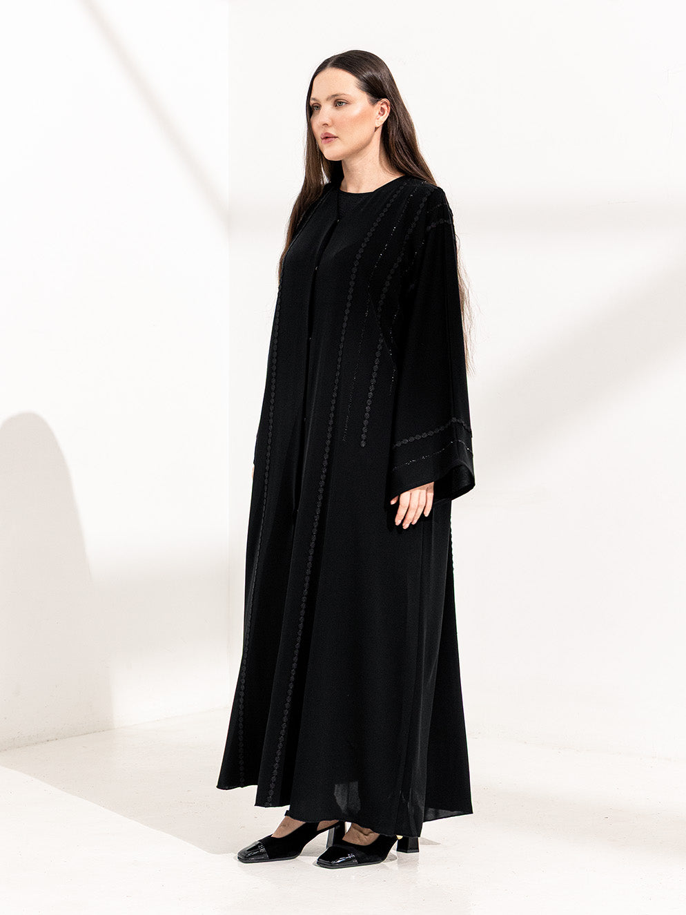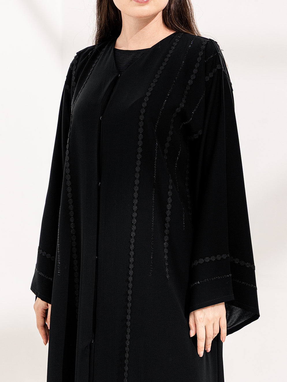 عباية سوداء بسوادٍ فاحم يعكس الفخامة والرقي، مطرزة بعناية بتفاصيل دقيقة تضيف لمسة راقية وأنثوية مميزة.